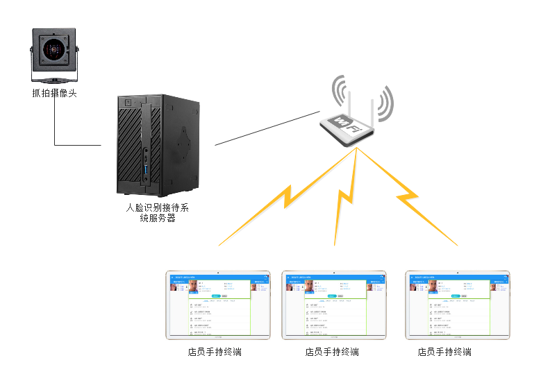 整个系统对硬件要求不高,整体的硬件投入成本较低。最基本的配置只需要一个摄像头、一台服务器、一个无线路由器还有一台平板电脑即可。服务器的外观尺寸也是经过定制宽高跟平板电脑相差无几,服务器的性能并没有因为尺寸而有降低,相反服务器配置都是高端芯片,再经过我们的特别优化,性能丝毫不逊于大尺寸服务器。 而系统拓展灵活,商家可以根据自己的实际情况增加抓拍摄像头,达到更好的效果。